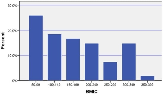 Percentage distribution of breast milk iodine concentration (BMIC) (µg/L).