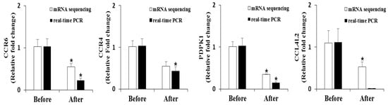 Total RNA was reverse-transcribed into cDNA using the QuantiTect reverse transcription kit (QIAGEN Gmblh, Hilden, Germany), and mRNA expression was quantified by real-time quantitative PCR using the SYBR green PCR kit (QIAGEN Gmblh) and a CFX96TM real-time system (Bio-Rad). Primers were designed to detect Phosphoinositide-dependent protein kinase-1 (PDPK-1, 5170), CC chemokine receptor 4 (CCR4, 1233), CC chemokine receptor 6 (CCR6, 1235) and CC chemokine ligand 4-like 2 (CCL4L2, 9560). The amplification was performed as follows: 10 min at 90 °C, 15 s at 95 °C, and 60 s at 60 °C, for a total of 40 cycles. The Ct values were normalized to corresponding glyceraldehyde 3-phosphate dehydrogenase (GAPDH) values, and the relative gene expression was calculated using the 2