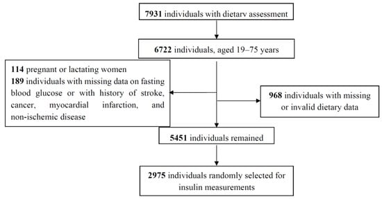 This cross-sectional study is based on data from the Tehran Lipid and Glucose Study (TLGS), an ongoing community-based cohort study aiming to investigate the prevalence and incidence of chronic diseases and their risk factors [24]. The TLGS was initiated in 1999–2001 with 15,005 subjects, aged ≥ 3 years, who were residents of district 13 of Tehran. After determining the prevalence of chronic diseases and their risk factors at baseline examination, participants have been followed every three years to update their information. In this study, the data collected at the fourth follow-up examination (2009–2011) was used. Of 12,523 individuals, who participated in the fourth follow-up examination, 7931 individuals were randomly selected for dietary assessments. For the current study, 6722 men and women, aged 19–75 years were selected. Pregnant and lactating women and those with missing information on fasting blood glucose, those with a history of stroke, cancer, myocardial infarction and non-ischemic disease were excluded. Participants with total energy intake outside predefined limits (n = 645; total energy intake <800 kcal/day or >4200 kcal/day for men; <600 kcal/day or >3500 kcal/day for women) and individuals with outlier intakes of at least one of the food parameters (n = 323; ≥3.3 standard deviation (SD)) also were excluded. Finally, 5451 participants remained, of whom 2975 subjects were randomly selected for insulin measurements and further investigations in this study (Figure 1). The ethics committee of the Research Institute for Endocrine Sciences of Shahid Beheshti University of Medical Sciences approved the study protocol, and written informed consent was obtained from all participants.
