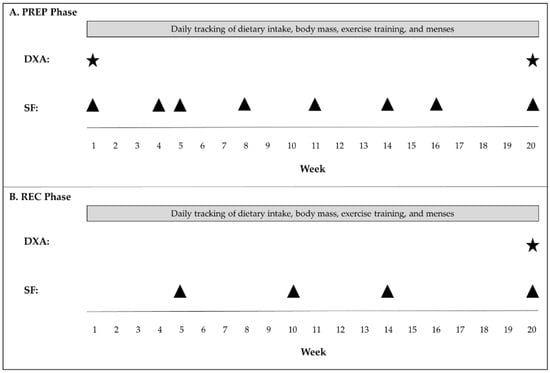 Before and at weeks, 1, 10, and 20 of PREP and weeks 10 and 20 of REC energy availability (EA) ((energy intake (kcals)-EEE (kcals))/fat-free mass (FFM) (kg)) [27] was calculated from the dietary intake record, exercise training record, and estimated FFM of the corresponding week. The established threshold of 30 kcal/kg was used as the reference level for comparing this subject’s EA to the level below which adverse health outcomes have been detected [21].