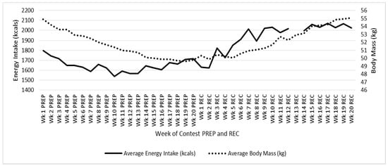 Changes in Energy Intake and Body Mass during Competition Preparation and Recovery. PREP: Competition preparation; REC: Competition recovery.