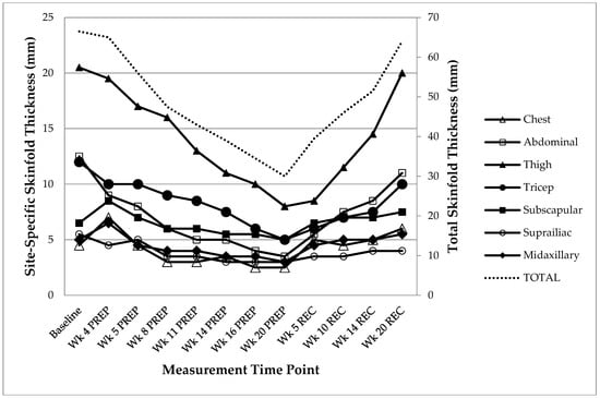 Total and site-specific skinfold thickness changes during PREP and REC are presented in Figure 3. Total skinfold thickness decreased from 66.5 mm at Baseline to 30 mm by the week of competition (Week 20 PREP) (corresponding to a decrease from 14.8% to 8.3% body fat, indicating concordance with the DXA results). Skinfold thickness steadily increased in the REC period and returned to baseline (64 mm) by Week 20 REC.