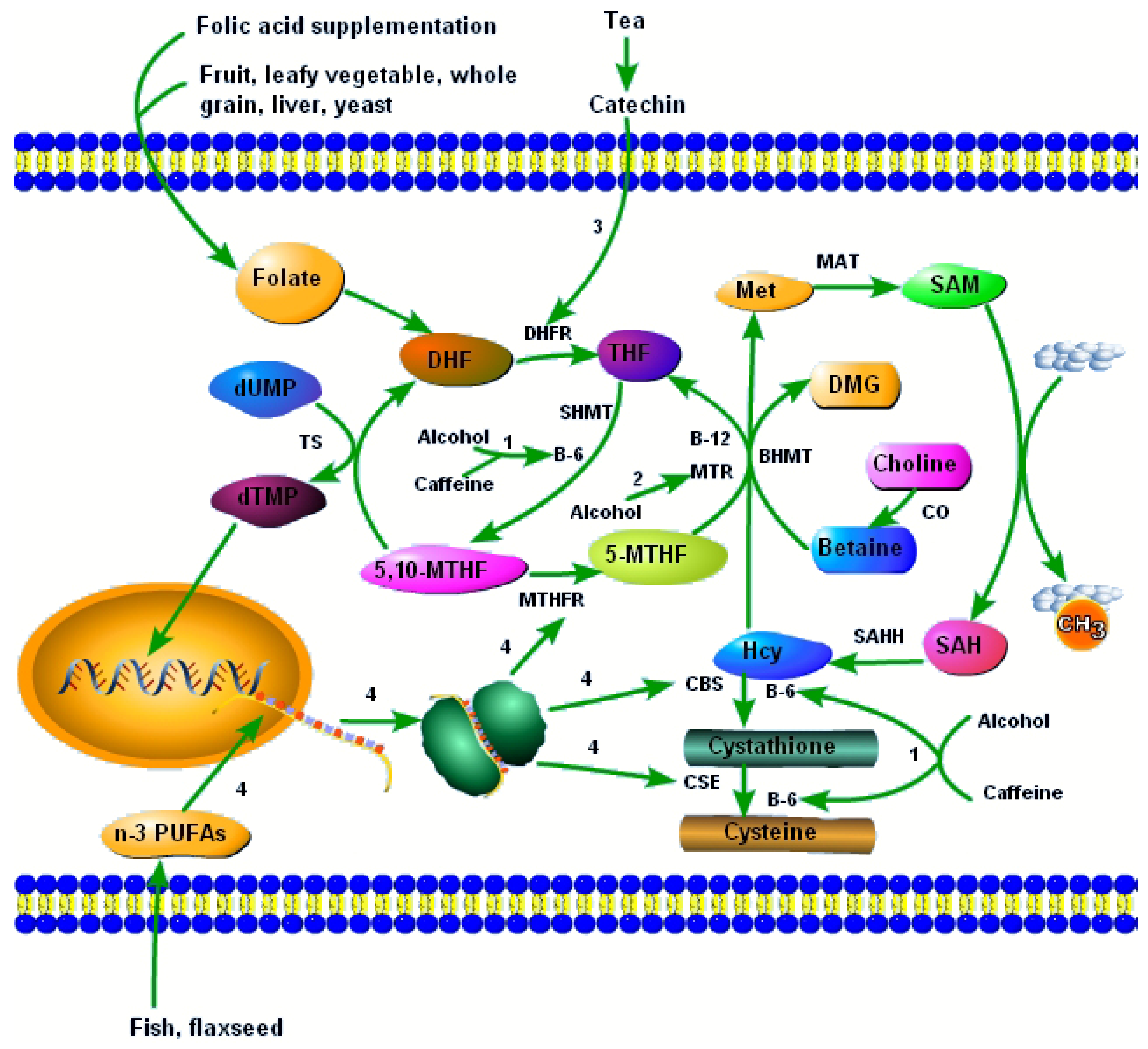 B vitamins and other dietary factors interact with the one-carbon metabolism to influence the development of NTDs. 1, alcohol and caffeine lower vitamin B-6, and thus disturb vitamin B-6–dependent one-carbon metabolism pathways; 2, alcohol reduces the activity of MTR, leading to increased Hcy and reduced SAM; 3, catechins in tea reduce the activity of DHFR, and hinder the synthesis of THF; 4, n-3 PUFAs increase the mRNA expression of enzymes involved in one-carbon metabolism, such as MTHFR, CBS, and CSE. Abbreviations: DHF, dihydrofolate; THF, tetrahydrofolate; 5,10-MTHF, 5,10-methylenetetrahydrofolate; 5-MTHF, 5-methyltetrahydrofolate; dUMP, deoxyuridine monophosphate; dTMP, thymidinemonophosphate; Hcy, homocysteine; Met, methionine; SAM, S-adenosylmethionine; SAH, S-adenosylhomocysteine; DMG, dimethylglycine; DHFR, dihydrofolate reductase; SHMT, serine hydroxymethyltransferase; MTHFR, methylenetetrahydrofolate reductase; MTR, 5-methyltetrahydrofolate-homocysteine methyltransferase; TS, thymidylate synthase; BHMT, betaine-homocysteine methyltransferase; MAT, methionine adenosyltransferase; SAHH, S-adenosylhomocysteine hydrolase; CBS, cystathionine-beta-synthase; CSE, cystathionine-gamma-lyase.
