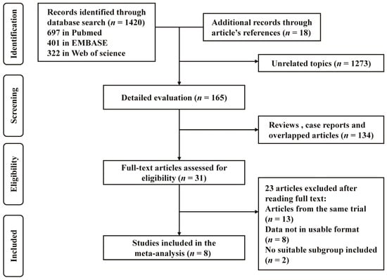 Flow diagram showing the identification of relevant studies in the meta-analysis. The initial 1438 articles were identified, and after 1273 unrelated papers and 134 reviews and case reports were excluded, 31 full texts were assessed for eligibility. Finally, after excluding 23 studies, a total of eight articles were included in this meta-analysis.