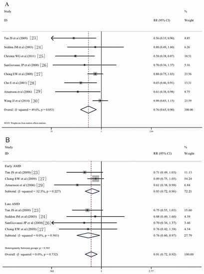 The pooled estimation on fish consumption and risk of AMD showed that fish consumption can reduce the incidence of AMD. In this meta-analysis, the meta-analyzed RR was 0.76 (95% CI, 0.65–0.90) when any AMD was considered (Figure 2A). Subgroup analysis by AMD stage showed that fish consumption could reduce the risk of both early (RR, 0.83; 95% CI, 0.72–0.96) and late (RR; 0.76; 95% CI, 0.60–0.97) AMD.