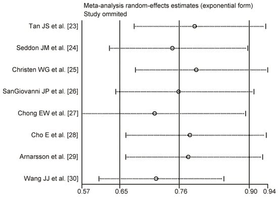 A one-way sensitivity analysis was conducted, and there was little change in the quantitative summary measures of RR or the 95% CI. There were no studies influencing results of fish consumption on AMD. The results of the one-way sensitivity analysis are presented in Figure 3.