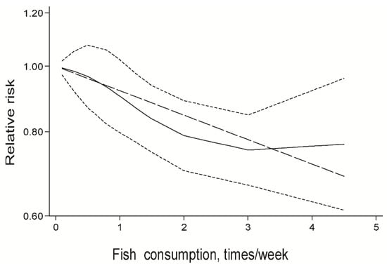 Dose-response relation between fish consumption and relative risks of AMD risk. Lines with short dashes represent the point wise 95% confidence intervals for the fitted nonlinear trend (solid line). Lines with long dashes represent the linear trend.