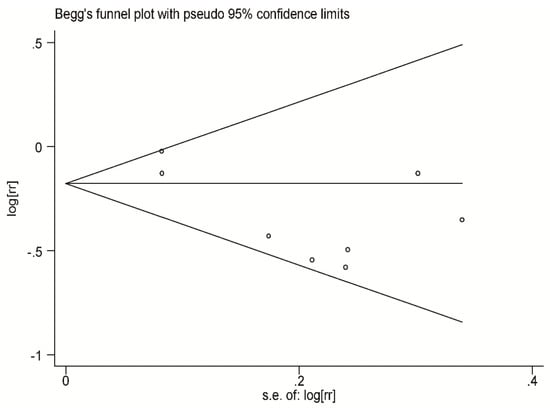 No significant publication bias in the current meta-analysis was detected using either Begg’s graph or Egger’s test. The funnel plot was symmetrical on visual inspection (Figure 5). In the quantitative assessment, no significant publication bias was detected (Begg’s test, p = 0.711; Egger’s test, p = 0.068).