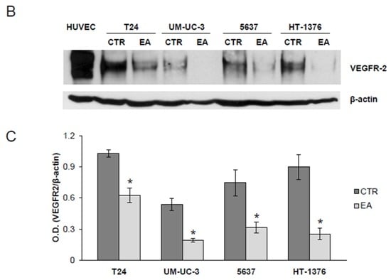 3.3. Ellagic Acid Reduces VEGFR-2 Expression in Human Bladder Cancer Cells