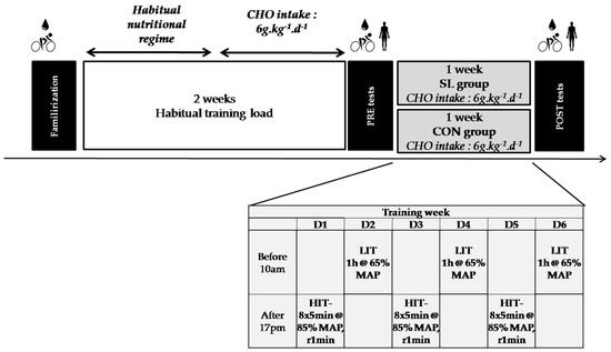 An overview of the study design is depicted in the Figure 1. Subjects were first assigned to a familiarization session to the testing protocol. Then, during the following two weeks, they trained according to their habitual training program. During the first week, they ate according to their usual dietary habits, documenting their food intake via a daily food diary. In the second week, they followed specific nutritional guidelines, which set their CHO intake at 6 g·kg−1·day−1, while continuing to keep their daily food diary. After the two weeks of habitual training load, subjects were assigned to the PRE test session. Then, they were randomly assigned to two different groups undertaking the same one-week training program but following different nutritional guidelines, according to the “sleep-low” strategy, previously described [14,15]. CHO intake was similar between groups (6 g·kg−1·day−1) but periodized differently over the day, according to the demands of the training sessions. Specifically, one group trained with a high CHO availability (control group, CON group, n = 9) with an even spread of CHO intake over the day and between training sessions. Meanwhile, the intervention group trained with a CHO intake that was periodized within the various days (“sleep-low” group, SL group, n = 12) such that no CHO was consumed between the high intensity interval training sessions (HIT) held late in the day and the end of the following morning’s low–moderate intensity (LIT) training session. The protocol ended with a POST test session.