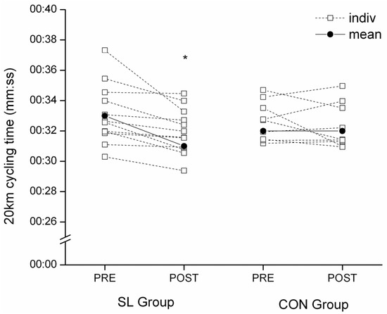 Individual 20 km cycling time-trial performance for SL and CON groups in PRE and POST tests. * Significantly different from PRE values, p < 0.05.