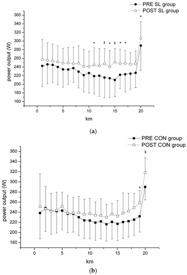 Pacing strategy (absolute change in power output per kilometer) during the 20 km cycling time-trial in PRE and POST tests for (a) SL group; and (b) CON group. * Significantly different from PRE values, p < 0.05. $ Significantly different from PRE values, p < 0.01.