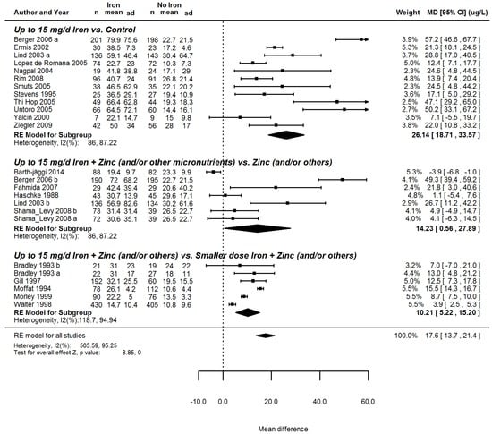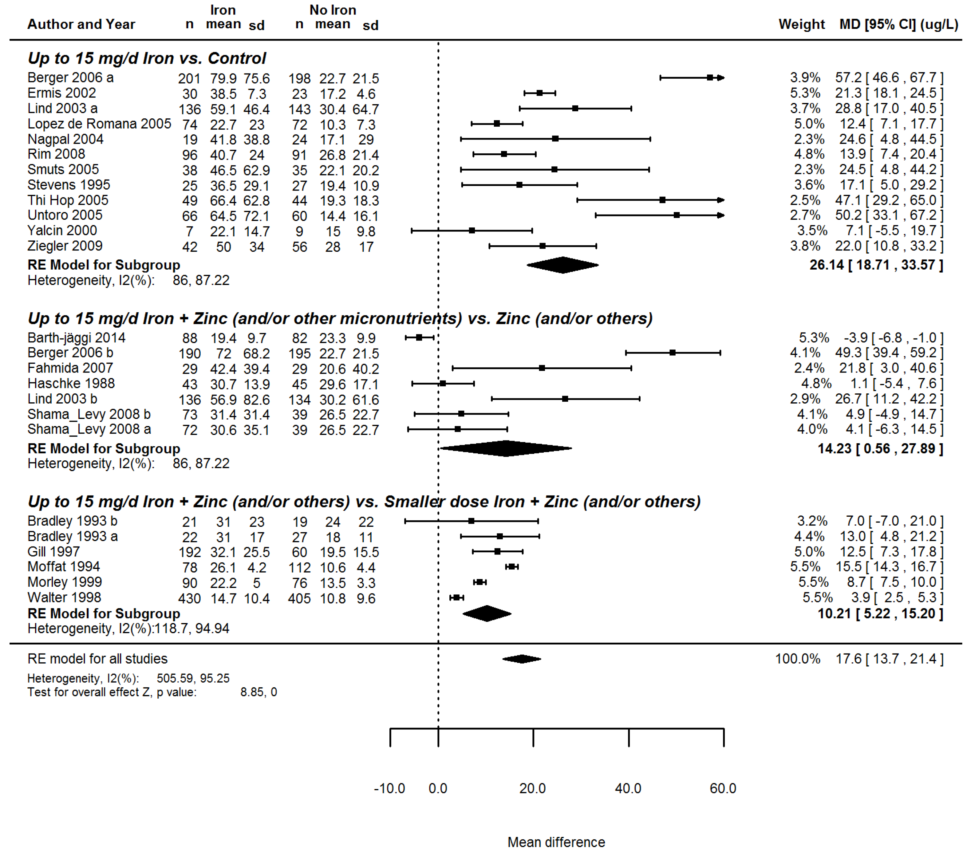Sub-group analyses of the 21 RCTs [26,27,28,31,32,33,34,36,37,38,40,42,44,45,48,49,50,51,52,53,54] reporting on the effect of iron interventions on serum ferritin indicated that iron has the strongest beneficial effect when it is the sole micronutrient administered (mean increase of 26.1 µg/L) and that it has a smaller, albeit significant, effect on serum ferritin when it is administered in combination with zinc (Figure 1).
