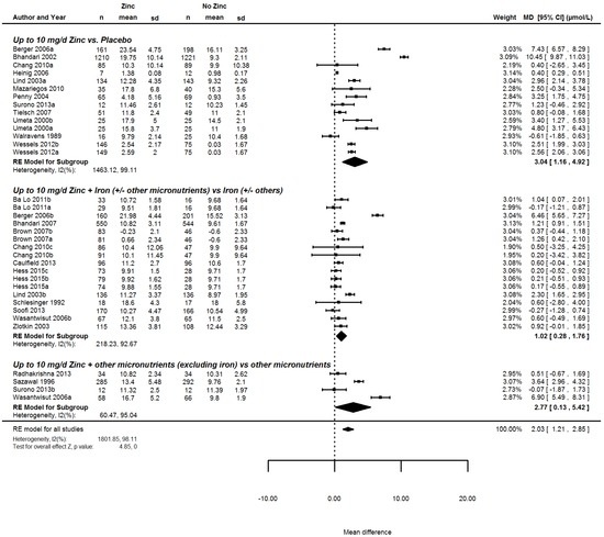 We found 23 studies [36,43,48,59,70,71,72,73,74,75,76,77,78,79,80,81,82,83,84,85,86,87,88], with 35 comparisons, 14 of them comparing zinc alone to placebo, 17 of them comparing zinc in combination with iron to iron only and four of them comparing zinc and other micronutrients to other micronutrients. Sub-group analyses showed that if iron was part of the intervention, the effect of zinc on serum/plasma zinc concentrations was considerably lower (1.02 µmol/L, 95% CI 0.28, 1.76), compared to interventions delivering zinc alone (3.04 µmol/L, 95% CI 1.16, 4.92) and to interventions delivering zinc and other micronutrients, excluding iron (2.77 µmol/L, 95% CI 0.13, 5.42; Figure 2).