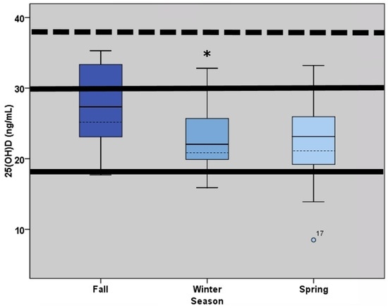 Box plots illustrating the distribution of 25(OH)D concentration (ng/mL) in the fall (n = 19), winter (n = 16), and spring (n = 16). Box extents indicate the 25th and 75th percentile, with the median indicated by a solid dark line and the mean indicated by a dashed line. Central vertical lines (whiskers) extend up to 1.5 interquartile ranges from the end of the box. A circle marks individual points outside of the whiskers indicating a value between 1.5 and 3.0 interquartile ranges of the box. 25(OH)D concentrations <20 ng/mL are considered deficient, concentrations between 20 and 32 ng/mL are considered insufficient (solid horizontal lines), and concentrations >40 ng/mL are considered optimal. * Significant decrease in 25(OH)D observed between fall and winter (p < 0.001), reported as mean ± SD.