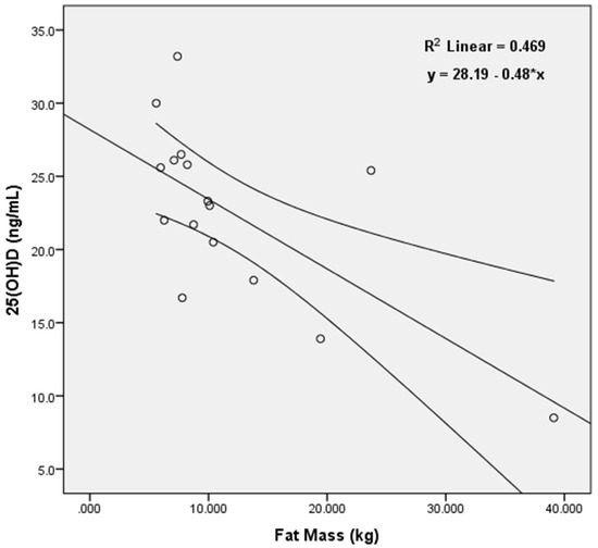 Linear regression model illustrating the association between 25(OH)D and fat mass (kg) in the spring (n = 16). Negative associations between these two variables were also observed in the fall and winter.