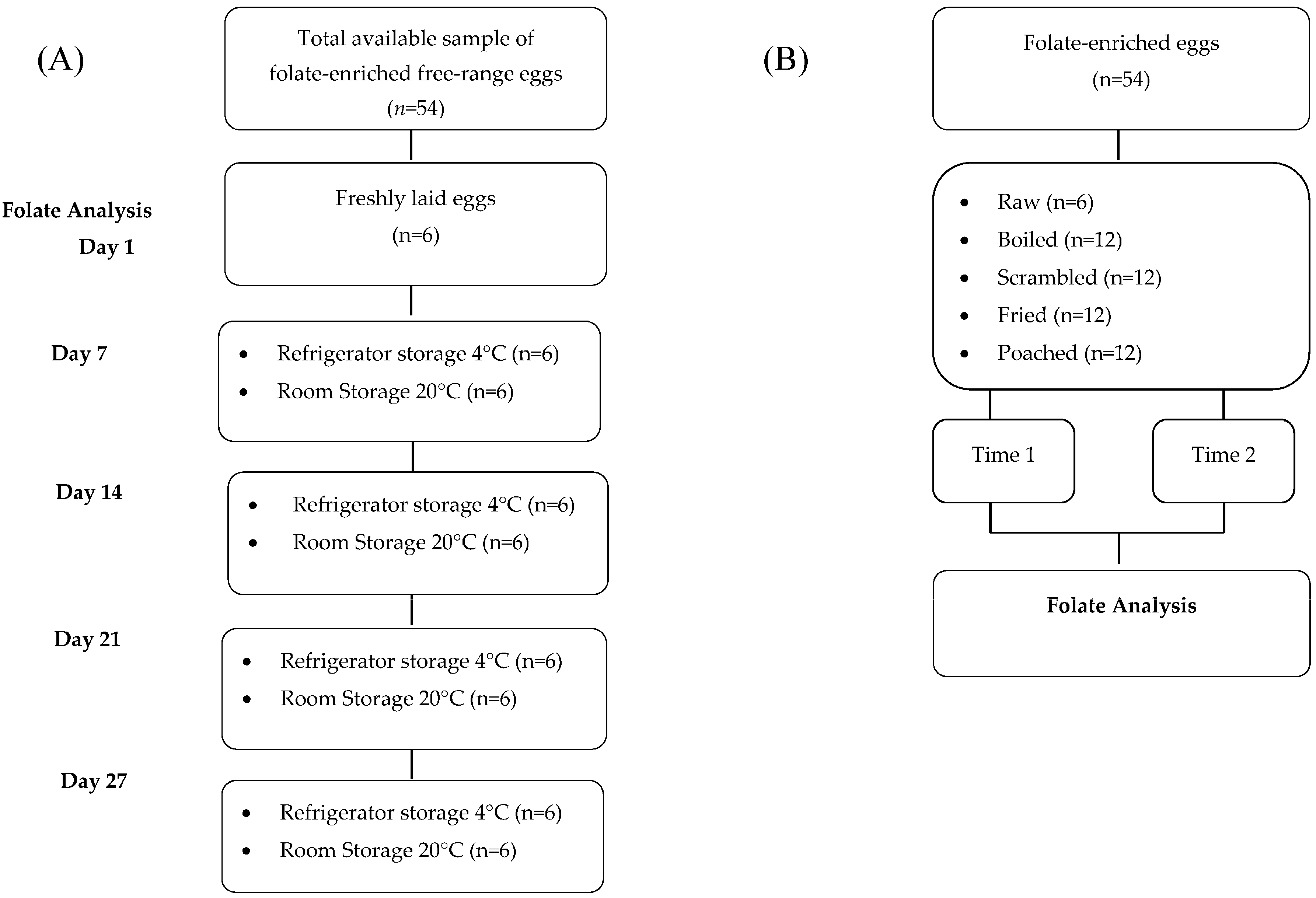 - Hoey, L.; McNulty, H.; McCann, E.M.E.; McCracken, K.J.; Scott, J.M.; Marc, B.B.; Molloy, A.M.; Graham, C.; Pentieva, K. Laying hens can convert high doses of folic acid added to the feed into natural folates in eggs providing a novel source of food folate. Br. J. Nutr. 2009, 101, 206–212. [Google Scholar] [CrossRef] [PubMed]