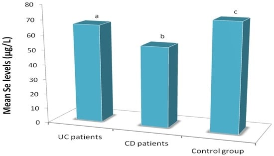 Mean serum Se levels in patients with ulcerative colitis (UC) or Crohn’s disease (CD) and healthy controls (p < 0.01; mean values with different letters (a,b,c), significant difference).