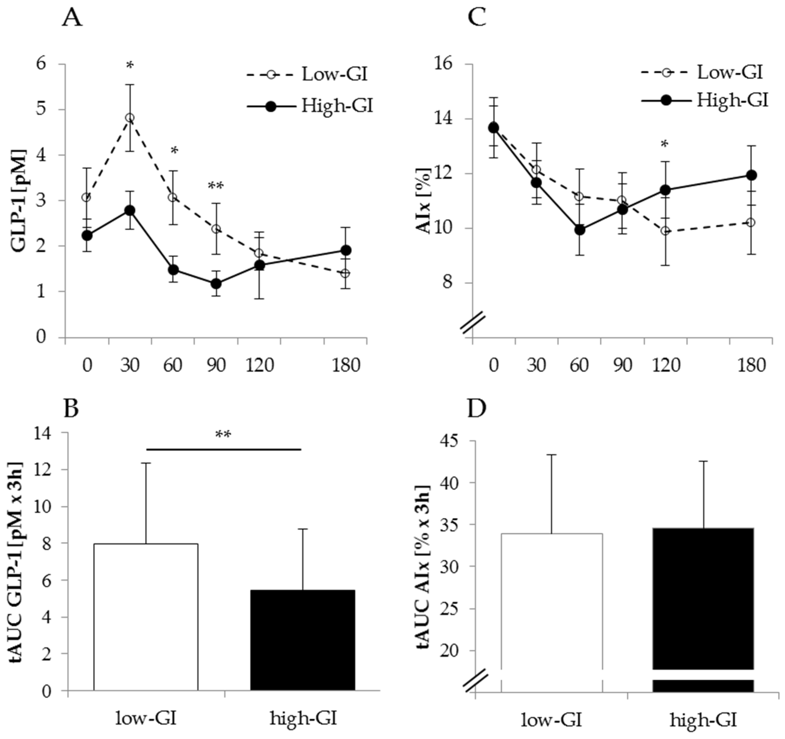 Figure 2. Comparison of postprandial Glucagon-like-peptide 1 (GLP-1) (A,B) levels and augmentation index (C,D) after intake of low glycemic index ( ) vs. high glycemic index ( ) SSB at the end of one week of low physical activity. AIx, augmentation index; GLP1, glucagon-like peptide-1; SSB: sugar-sweetened beverages; tAUC, total area under the curve; upper panel: mean ± SEM, lower panel: mean ± SD; differences between tAUC for low-GI and high-GI SSB were tested using paired t-test, * p < 0.05; ** p < 0.01.