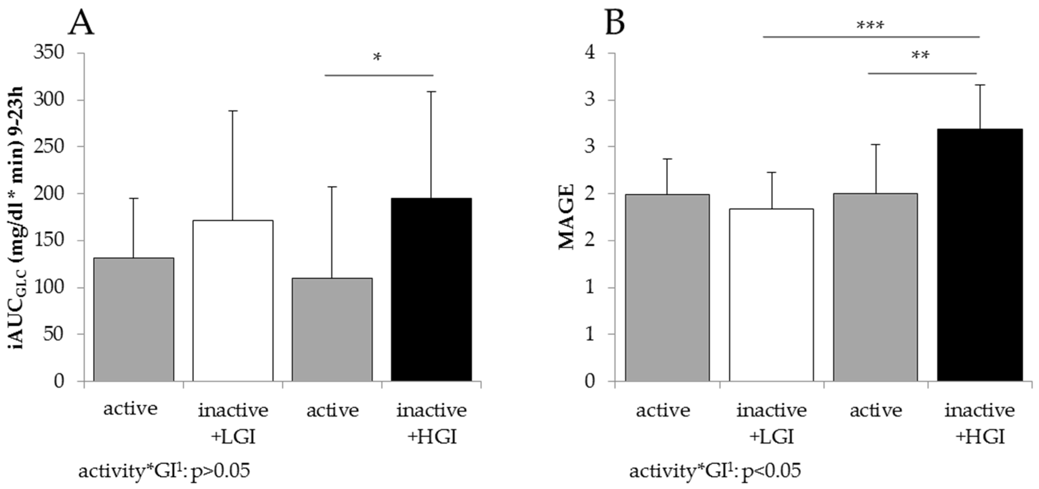Figure 3. Daytime glycemia (iAUCGLC, A) and glucose variability (MAGE, B) during active and inactive phases with low-GI and high-GI SSB intervention. iAUC: incremental area under the curve; MAGE: mean amplitude of glycemic excursions; low-GI (LGI): beverages sweetened with isomaltulose; high-GI (HGI): beverages sweetened with a mixture of maltodextrin (75%) and sucrose (25%); mean ± SD; two-way ANOVA with Bonferroni adjustment and paired t-test, * p < 0.05; ** p < 0.01, *** p < 0.001.