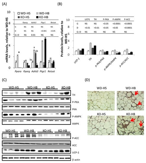 Levels of mRNA (A) and proteins (B) serve as markers involved in β-adrenergic stimulation and white adipose tissue (WAT) browning in the inguinal fat of WD and KO mice fed HS or HB diet for 5 weeks; (C) representative picture of immunoblot; (D) immunohistochemical staining of uncoupled protein 1 (UCP-1) in inguinal fat. In (A,B), data are mean ± SEM, n = 8. Results of two-way ANOVA are shown in the tables (D, diet; G, genotype; D × G, interaction; NS, not significant). When there was a significant interaction between D and G, the significance of differences among groups was further analyzed by one-way ANOVA and Duncan’s multiple range test. a–c Values without a common superscript differed (p < 0.05). * Different from WD-HS, p < 0.05 (by Student’s t test). In (D), brown fat-like cells are indicated with arrowheads.