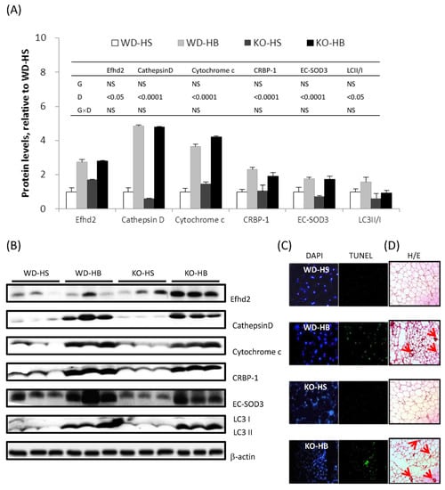 Proteins known to be upregulated by BMSO administration and associated with WAT delipidation, inflammation, browning, apoptosis, and autophagy were measured by immunoblotting (Figure 3A,B). Among them, Efhd2/swiprosin depends on a stabilized actin cytoskeleton that is required for immune responses [21]. Cathepsin D is a lysosomal protease closely linked to autophagy [22]. Cytochrome c and CRBP-1 serve as markers for mitochondria and preadipocyte numbers, respectively [23]. Antioxidative enzyme EC-SOD3 defends tissue from reactive oxygen species (ROS)-induced damage. LC3 II/I ratio serves as an indicator of autophagy. Irrespective of genotype, HB diet increased protein concentrations of Efhd2/swiprosin, cathepsin D, cytochrome c and CRBP-1, EC-SOD3, and the LC3 II/I ratio in inguinal fat. Based on TUNEL, there were apoptotic nuclei in the inguinal fat of both genotypes receiving HB, but not the HS diet (Figure 3C). Macrophage infiltration into WAT was evident based on crownlike structure (CLS) in groups WD-HB and KO-HB (Figure 3D).