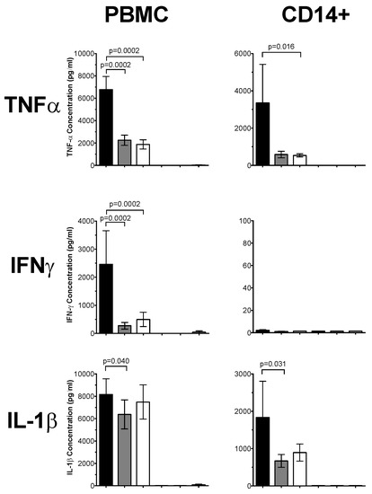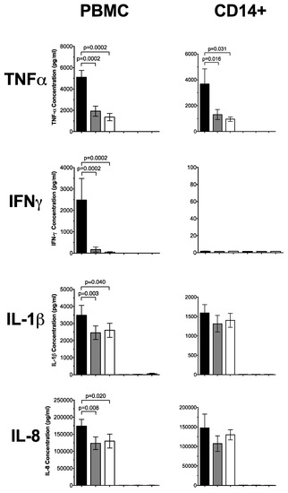 Levels of TNF-α, IFN-γ, IL-1β, IL-10, IL-4, IL-8, and IL-17A in cultured supernatants from PBMCs and CD14+ monocytes were measured using a commercial Milliplex human cytokine multiplex bead array method, as per the manufacturer’s instructions (Milliplex; Millipore Corporation, Billerica, MA, USA).