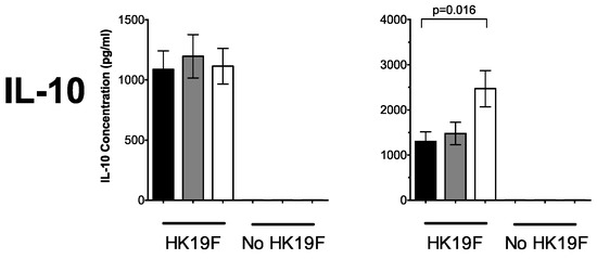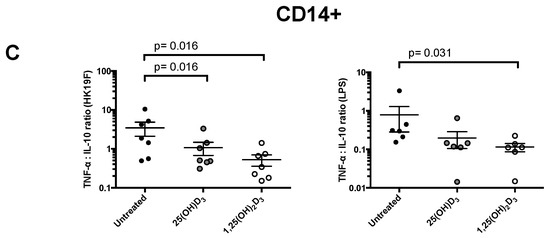 We investigated whether 1,25(OH)2D3 or 25(OH)D3 modulates the pro-inflammatory/anti-inflammatory balance in response to TLR stimulation. In HK19F-stimulated PBMCs, 1,25(OH)2D3 shifted the cytokine ratio towards an anti-inflammatory phenotype by 4.5-fold (p = 0.0002) for TNF-α/IL-10 ratio, while for the IFN-γ/IL-10 ratio, this was decreased by 79-fold (p = 0.0002) (Figure 3). For LPS-stimulated PBMCs, a similar effect was observed with 1,25(OH)2D3 in comparison to untreated groups for TNF-α/IL-10 (p = 0.0002) and for IFN-γ/IL-10 (p = 0.0002) (Figure 4B). A shift towards an anti-inflammatory phenotype was also observed for TNF-α/IL-10 ratio in HK19F (6.5-fold, p = 0.016) and LPS (7.2-fold, p = 0.031) stimulated CD14+ monocytes treated with 1,25(OH)2D3 (Figure 3).
