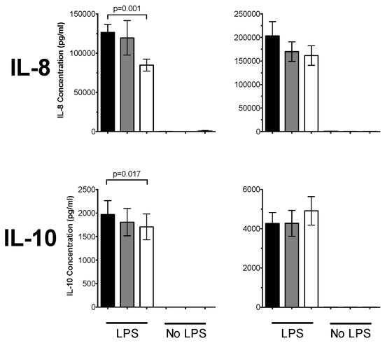 For PBMCs stimulated with LPS, TNF-α was significantly reduced by 3.6-fold and three-fold by 1,25(OH)2D3 and 25(OH)D3, respectively (p = 0.0002; Figure 2). The IFN-γ concentrations were also significantly reduced in PBMCs treated with 25(OH)D3 (9-fold, p = 0.0002) and 1,25(OH)2D3 (five-fold, p = 0.0002) compared to untreated PBMCs. PBMCs treated with 25(OH)D3 significantly reduced IL-1β (1.3-fold; p = 0.04), whereas PBMCs treated with 1,25(OH)2D3 significantly reduced IL-10 (1.2-fold, p = 0.017) and IL-8 (1.5-fold; p = 0.001). In LPS-stimulated CD14+ monocytes, 1,25(OH)2D3 significantly reduced TNF-α by 6.2-fold (p = 0.016) compared to untreated monocytes. The CD14+ monocytes treated with 25(OH)D3 significantly reduced IL-1β by 2.7-fold (p = 0.031), but not for 1,25(OH)2D3.