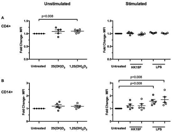 We next examined the phenotype of key immune cell subsets in PBMCs following pre-treatment with 1,25(OH)2D3 or 25(OH)D3. In unstimulated PBMCs, 1,25(OH)2D3 significantly increased CD4 expression on T cells (p = 0.008; Figure 4A) while for HK19F, 1,25(OH)2D3 had no effect on CD4 or CD14 expression (Figure 4A,B). For LPS-stimulated PBMCs, expression of CD14 was increased 1.7-fold (p = 0.008) by treatment with 1,25(OH)2D3 and 25(OH)D3, but no change was observed for CD4 expression (Figure 4A).