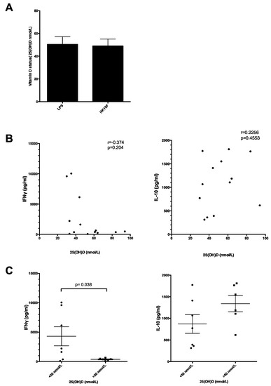 We then examined whether circulating vitamin D status affected cytokine responses following HK19F and LPS stimulation. There was a similar 25(OH)D status between individuals used for each experiment (Figure 5A). Although no significant correlation was found between plasma 25(OH)D levels and IFN-γ concentrations (Figure 5B), individuals with 25(OH)D insufficiency (<50 nmol/L) exhibited 11.7-fold (p = 0.038) higher IFN-γ following HK19F stimulation compared to 25(OH)D sufficient (>50 nmol/L) individuals (Figure 5C). There was a weak correlation between plasma 25(OH)D levels and IL-10 concentrations (r = 0.2256; Figure 5B) with 25(OH)D sufficient individuals producing 1.5-fold higher IL-10 levels following HK19F stimulation compared to 25(OH)D insufficient individuals, although not significant (Figure 5C).