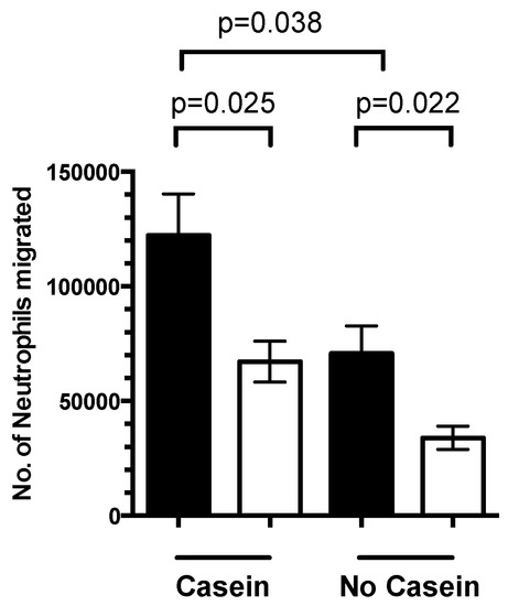 We wanted to extend the above findings to examine the effect of 1,25(OH)2D3 on neutrophil migration. Pre-treatment of neutrophils with 1,25(OH)2D3 showed a 57% reduction in neutrophil migration in the absence of casein compared with untreated neutrophils (p = 0.022) (Figure 6). In casein-stimulated cells, pre-treatment with 1,25(OH)2D3 reduced neutrophil migration by 46% (p = 0.038) compared to untreated neutrophils.