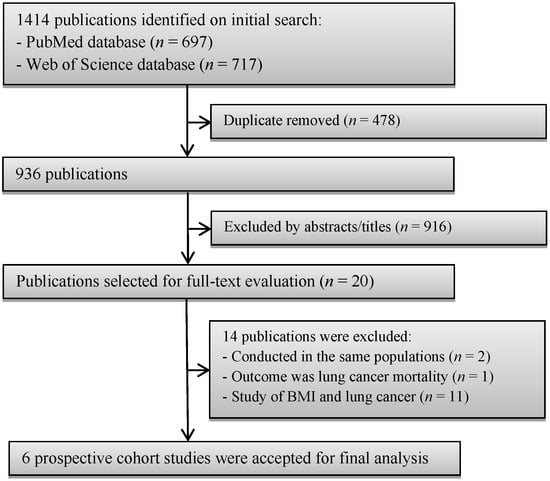 A flow chart of study selection, including reasons for exclusion, is presented in Figure 1. During the initial search, we briefly identified 1414 articles from PubMed and Web of Science databases; most were excluded because they were retrospective studies or because the exposure or outcome was not relevant to our analysis, leaving 20 potentially eligible articles for full-text review. After careful review, 14 articles were further excluded; among excluded articles, two articles were conducted in the same populations [15,32], one article examined central obesity and lung cancer mortality [22], and the remaining 11 studies were excluded because the risk estimate for the association of interest was not available. Finally, six prospective cohort studies [18,19,20,21,23,24] were included into our final analysis. The characteristics of the included studies are summarized and listed in Table 1. These studies were published between 2002 and 2016. All of the included studies had a prospective cohort design. A total of 5827 lung cancer cases were diagnosed among 831,535 participants. One prospective cohort study was conducted in China [24], one in European countries [21], and the remaining four in the USA [18,19,20,23]. Regarding the sex of the participants, four [18,19,23,24] studies evaluated only women, and the remaining two [20,21] included both sexes. The length of follow-up ranged from seven to 15.1 years. Individual studies adjusted for a wide range of potential confounding factors, such as age, physical activity, and smoking. The details of quality assessment according to the nine-star NOS are presented in the online Supplementary Materials Table S1. All studies were given scores of ≥7.