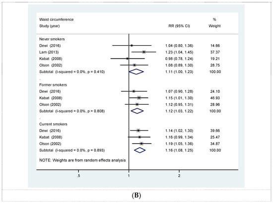 Five prospective cohort studies [18,19,20,21,23] were eligible for the analysis of WC and risk of lung cancer. All studies concerning this association were further adjusted for BMI. The summary RR for a 10 cm increase in WC was 1.10 (95% CI 1.04, 1.17) with moderate heterogeneity (I2 = 27.7%, p = 0.198) (Figure 2A). No evidence of publication bias was observed across studies (Begg, p = 0.404; Egger, p = 0.842). The summary RRs according to smoking status were 1.11 (95% CI 1.00, 1.23) for never smokers, 1.12 (95% CI 1.03, 1.22) for former smokers, and 1.16 (95% CI 1.08, 1.25) for current smokers (Figure 2B). Sensitivity analysis investigating the influence of a single study on the overall risk estimate by omitting one study at each turn yielded a range of RRs from 1.09 (95% CI 1.01, 1.18) to 1.13 (95% CI 1.08, 1.19). Furthermore, the summary RR for the highest versus lowest categories of WC was 1.32 (95% CI 1.13, 1.54) with low heterogeneity (I2 = 18.2%, p = 0.281) (Online Supplementary Materials Figure S1).