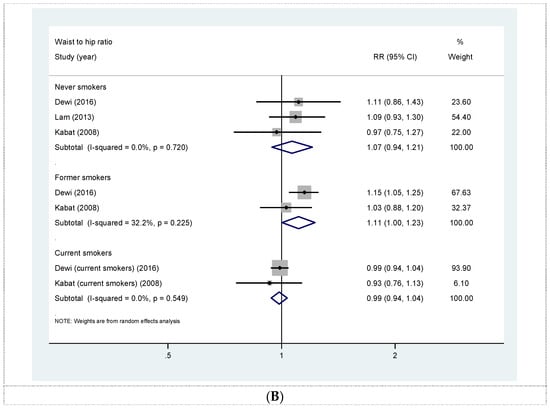 Six prospective cohort studies [18,19,20,21,23,24] were eligible for the analysis of WHR and risk of lung cancer. The summary RR for a 0.1 unit increase in WHR was 1.05 (95% CI 1.00, 1.11) with moderate heterogeneity (I2 = 25.2%, p = 0.211) (Figure 3A). No evidence of publication bias was observed across studies (Begg, p = 0.851; Egger, p = 0.962). The summary RRs according to smoking status were 1.07 (95% CI 0.94, 1.21) for never smokers, 1.11 (95% CI 1.00, 1.23) for former smokers, and 0.99 (95% CI 0.94, 1.04) for current smokers (Figure 3B). In a sensitivity analyses in which we omitted one study at a time, the overall association became slightly attenuated (RR 1.05, 95% CI 0.98, 1.12) by excluding the study by Dewi et al. [21]. In addition, the summary RR for the highest versus lowest categories of WC was 1.10 (95% CI 1.00, 1.23) with low heterogeneity (I2 = 24.2%, p = 0.211) (Online Supplementary Materials Figure S2).