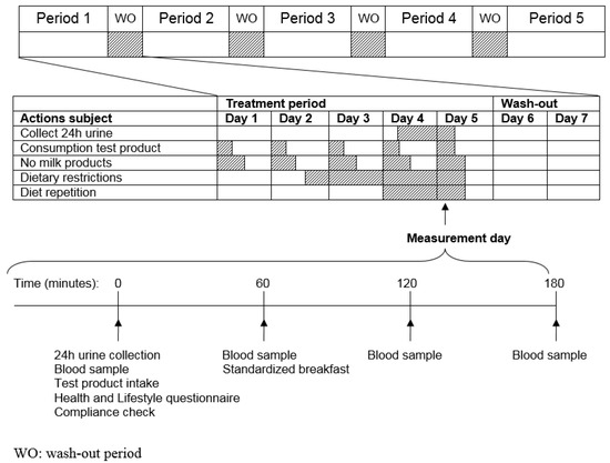 The total duration of the study was five weeks consisting of five consecutive five-day treatment periods with four two-day washout periods (WO) in-between. During each treatment period, subjects daily consumed one of the five test products one hour before breakfast. At the fourth day of each treatment period after intake of the test product subjects started collecting their urine for 24 h. On the fifth day of each period, subjects visited the study facility in a fasted state, handed in their 24 h-pooled urine collection container and received the last test product dose. On this day, blood was collected prior to (t = 0) and 1, 2, and 3 h after intake of the test product.