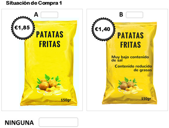 A total of 309 individuals participated in our RCE in groups with a maximum of 10–12 people, seated separately and far from each other to avoid communication between them during the experiment. All subjects gave their informed consent for inclusion before they participated in the study. The study was conducted in accordance with the Declaration of Helsinki, and the protocol was approved by the Ethics Committee of CITA (FP7-MC-CIG-332769). The RCE was conducted as follows. Before beginning the experiment, participants completed a questionnaire and they received €10 in cash at the end of the session as a participation fee. The questionnaire was designed to measure participants’ body image. In their seminar paper, Cash, Fleming, Alindogan, Steadman, and Whitehead [4] designed a new scale called the Body Image State Scale (BISS) that measured current body experience, used for both sexes and in any specific time or context. In this regard, the Body Image State Scale (BISS) assesses six fields: overall physical appearance; body size and shape; weight feelings; physical attractiveness; current feelings about one’s looks compared to how one typically feels; and the evaluation of one’s own appearance compared to the average person’s appearance. Items were rated on a nine-point, bipolar, Likert scale. Based on their BISS mode and BMI, subjects were then allocated into four different groups as follows: (i) non-obese people (BMI less than 30 kg/m2) with good body image (BISS more than 30) (NH); (ii) non-obese people (BMI less than 30 kg/m2) with body image dissatisfaction (BISS less than 30) (NL); (iii) obese people (BMI more than 30 kg/m2) with good body image (BISS more than 30) (OH); (iv) obese people (BMI more than 30 kg/m2) with body image dissatisfaction (BISS < 30) (OL). In addition, participants were informed previously about the product, the methodology, and the objective of the research. They were allowed to inspect the different potato chips on the market, containing nutritional facts in the choice sets. However, they did not receive any information about brand, ingredients, and processing method of the potato chips. Then, they were also told that they would be faced with different choice tasks, each described by three choice options: two different potato chips and a no-purchase option (see Figure 1). For each of these choice sets, they were asked to select on a sheet of paper the alternatives in each choice task they wanted to buy, if any. Finally, at the end of the experiment, each participant drew a number from an envelope between 1 and 12 (total number of choice sets), to determine the binding choice set. Accordingly, participants had to purchase and pay the ‘posted price’ for the potato chips they picked, if any, in the binding choice set. Participants received the packet of potato chips after paying for the product they chose, unless they picked the no-purchase option in the binding choice set.
