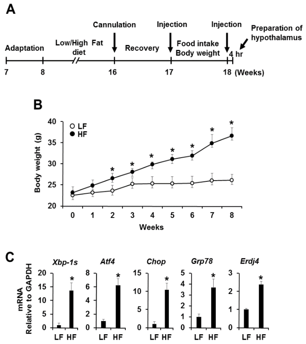 Increased hypothalamic ER stress in mice fed a high-fat diet. (A) Experimental timeline of the experimental procedure; (B) Time dependence of body weight in low fat and high-fat-diet-induced mice. At 8 weeks of age, mice fed a high-fat diet showed a 43% increase in body weight compared with those fed a low-fat diet. The results are means ± SDs (n = 10); * p values of < 0.05 indicate significant difference from low-fat diet-induced mice; (C) mRNA expression levels of ER stress responsive markers in low fat and high-fat-diet-induced mice. mRNA expression levels of ER stress responsive markers were dramatically upregulated in high-fat-diet-induced obese mice. The results are means ± SDs (n = 10); * p values of < 0.05 indicate significant difference from low-fat-diet-induced mice. LF, low-fat diet. HF, high-fat diet.