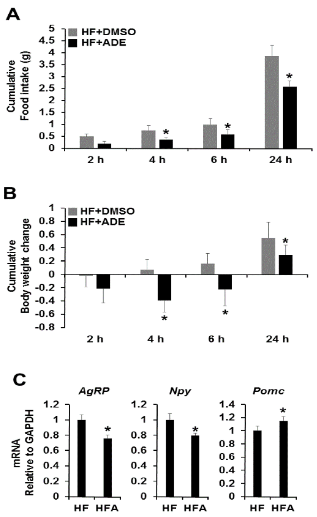 3.2. Central Administration of ADE Reduces Food Intake and Body Weight through Regulation of Appetite-Related Neuropeptides in High Fat Diet-Induced Mice