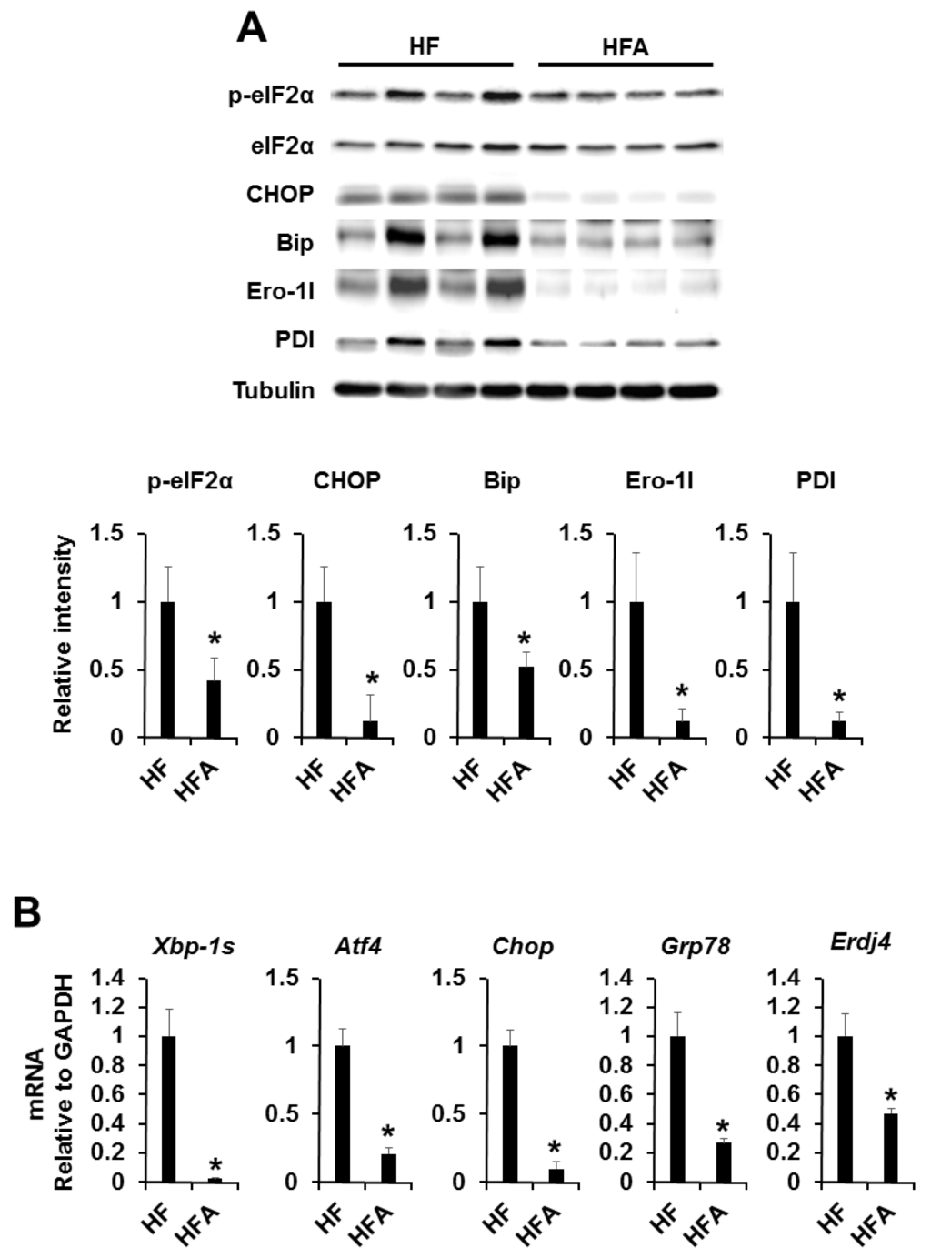 Effects of central administration of ADE on ER stress responsive markers and ER chaperone/foldases expression. (A) Effects of ICV administration of ADE (1 μL of 10 mg/mL) on hypothalamic ER stress responsive markers and ER chaperone/foldases. The results of densitometric analysis (lower) are means ± SDs (n = 10); * p values of < 0.05 indicate significant difference from administration with DMSO (1 μL of 20% DMSO); (B) Effects of ICV administration of ADE (1 μL of 10 mg/mL) on hypothalamic mRNA expression levels of hypothalamic ER stress responsive markers. The results are means ± SDs (n = 10 per group); * p values of < 0.05 indicate significant difference from administration with DMSO (1 μL of 20% DMSO). HF, high-fat diet with DMSO. HFA, high-fat diet with ADE.