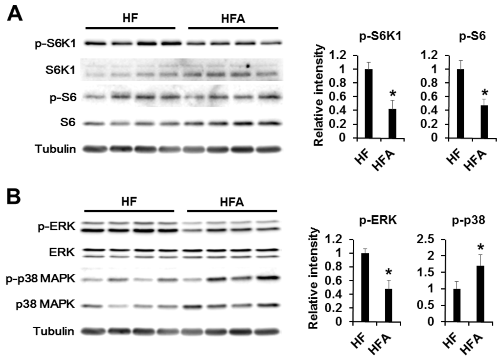 Ghrelin expression was elevated upon fasting and reduced upon feeding in normal and genetically obese rodents [40,41,42]. Based on these findings, we speculate that reduction of food intake and body weight by ADE may be due to antagonization of ghrelin function. In previous works, ICV injection of ghrelin induced orexigenic action by increasing mTOR and ERK signaling pathways [27,28,43,44]. Additionally, ghrelin was shown to inhibit p38 MAPK activation in oligodendrocytes and other types of cells [30,31]. Therefore, we determined levels of S6K1 and S6 phosphorylation, downstream signaling cascades of mTOR, and phosphorylation of MAPKs (ERK and p38) (Figure 4). Central administration of ADE significantly downregulated phosphorylation of S6K1, S6, and ERK as well as upregulation of p38 MAPK in mice fed a high-fat diet. However, low-fat-diet-induced mice showed no changes (Supplementary Figure S4). These result indicate that ADE reduces appetite by antagonizing ghrelin signaling cascades rather than leptin signaling, and mTOR and ERK signaling are necessary for appetite regulation of ADE in the hypothalamus in mice fed a high-fat diet.