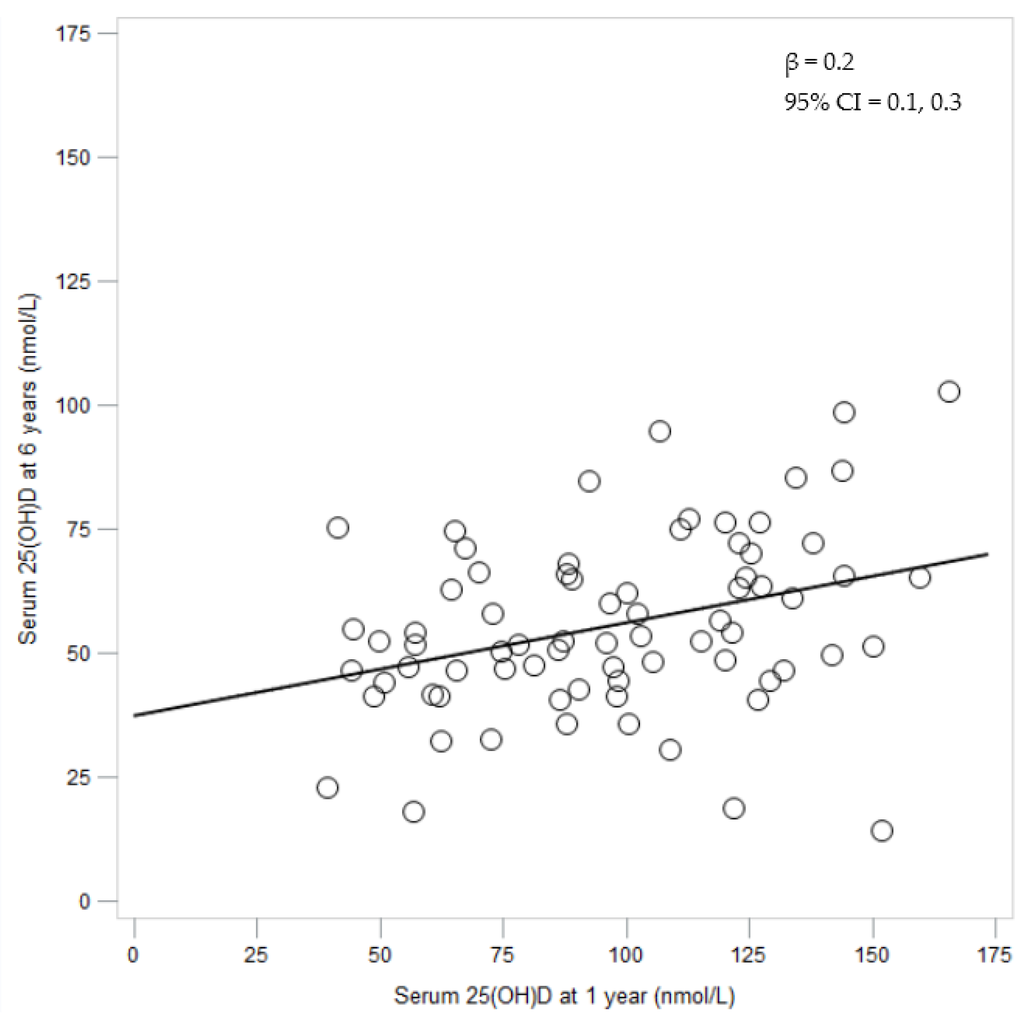There was a strong negative association between the serum 25(OH)D level assessed at 1 year and the change in serum 25(OH)D levels from 1 to 6 years of age (β = −0.8, 95% CI = −0.9, −0.7). The only other baseline variable associated with 25(OH)D change over time in a univariate linear model was vitamin D intake at 1 year (β = −1.9, 95% CI = −3.2, −0.6 when explored as µg/day and β = −19.1, 95% CI = −32.4, −5.7 when explored as µg/kg/day). The change in vitamin D intake from 1 to 6 years of age was also associated with the change in serum 25(OH)D levels from 1 to 6 years of age (β = 1.3, 95% CI = 0.4, 2.2 when explored as µg/day and β = 18.6, 95% CI = 6.5, 30.7 when explored as µg/kg/day). Gender, breastfeeding, anthropometrics, or maternal factors were not associated with 25(OH)D change over time.