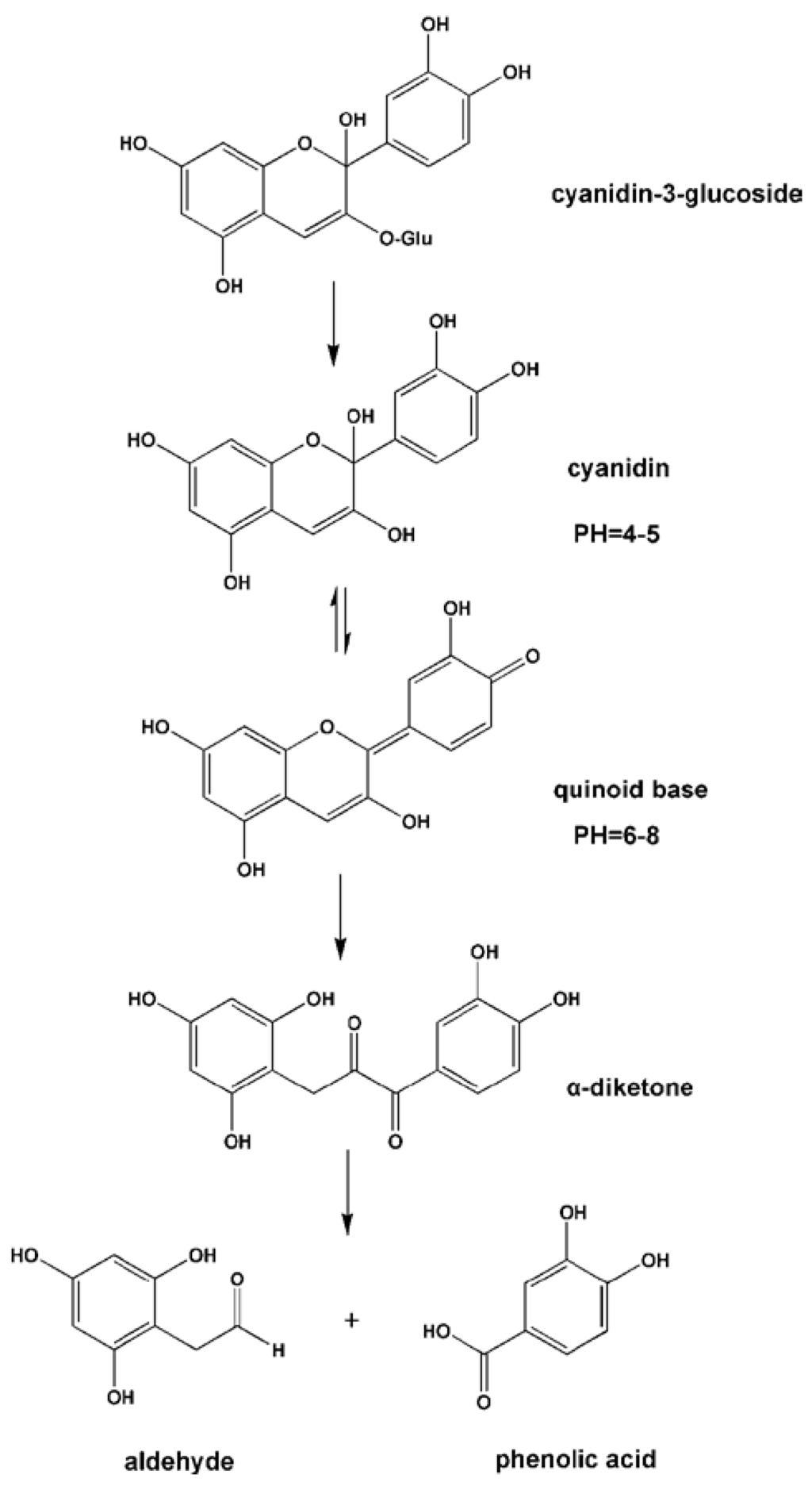 - Fleschhut, J.; Kratzer, F.; Rechkemmer, G.; Kulling, S.E. Stability and biotransformation of various dietary anthocyanins in vitro. Eur. J. Nutr. 2006, 45, 7–18. [Google Scholar] [CrossRef] [PubMed]