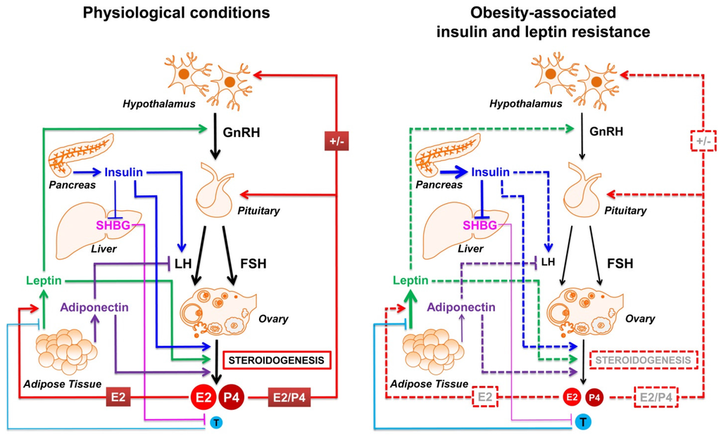 Effects of insulin, leptin and adiponectin on the regulation of hypothalamic pituitary gonadal axis (HPG) and steroidogenesis under physiological and obesity-associated conditions. Under physiological conditions (left) the signaling pathways of insulin, leptin and adiponectin are able to sense the nutritional status, and, jointly with sex hormones sustain ovarian activity and reproduction. In obesity (right), the increased levels of insulin and leptin lead to insulin and leptin resistance that, together with the reduced adiponectin levels, contribute to a dysregulation of both the HPG axis and ovarian steroidogenesis, by further worsening the endocrine milieu (impaired E2 and P4 synthesis, increased T synthesis and free levels due to reduced SHBG synthesis) and impairing ovarian function and fertility success rate. In the figure the dotted lines represent impaired regulations. E2 = 17β-estradiol; P4 = progesterone; T = testosterone.