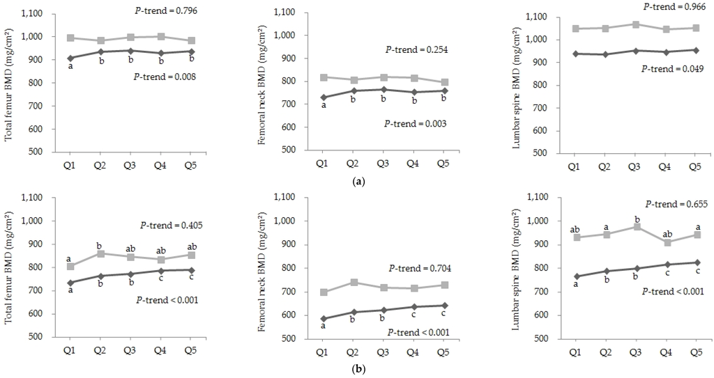 Association between bone mineral density (BMD) and quintile (Q) of the consumption of fish and shellfish (times/month) in men ≥50 years old (a) and postmenopausal women ≥50 years old (b) from the Korean National Health and Nutrition Examination Survey (KNHANES,