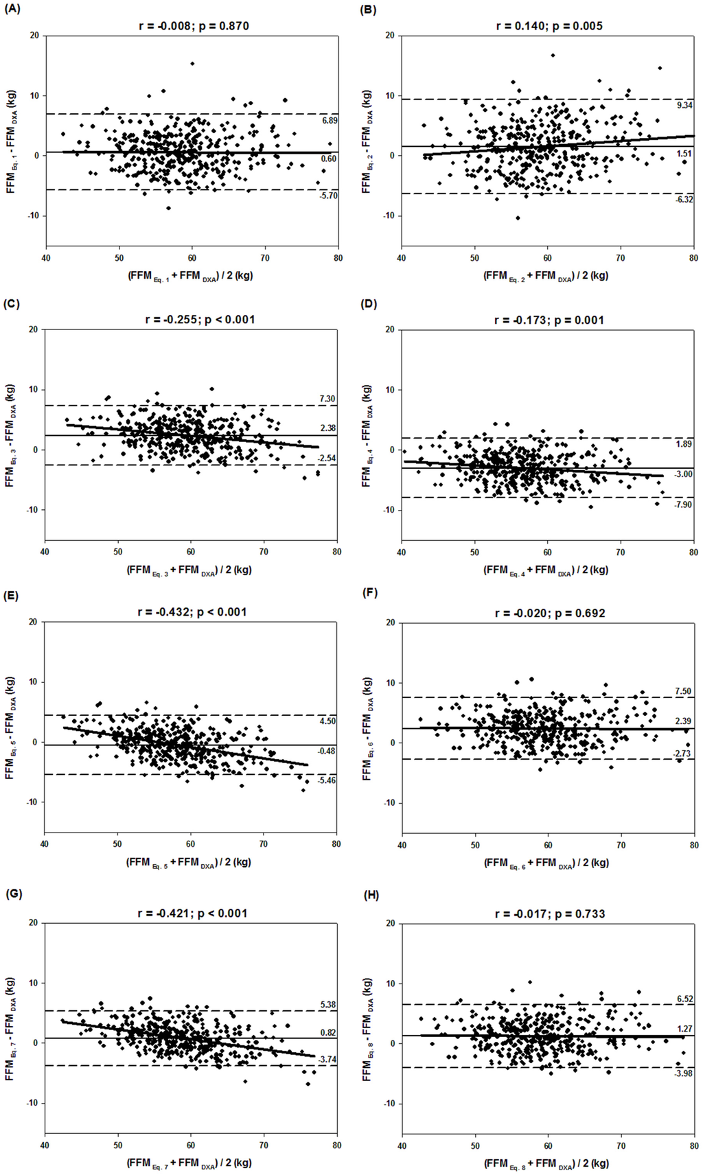 Figure 1 shows the agreement of methods (DXA and BIA) using the Bland–Altman analysis. All BIA equations showed large limits of agreement. In addition, Equations (2)–(5) and (7) showed significant trends (p < 0.05) between the differences and mean of methods, as observed from the r value.