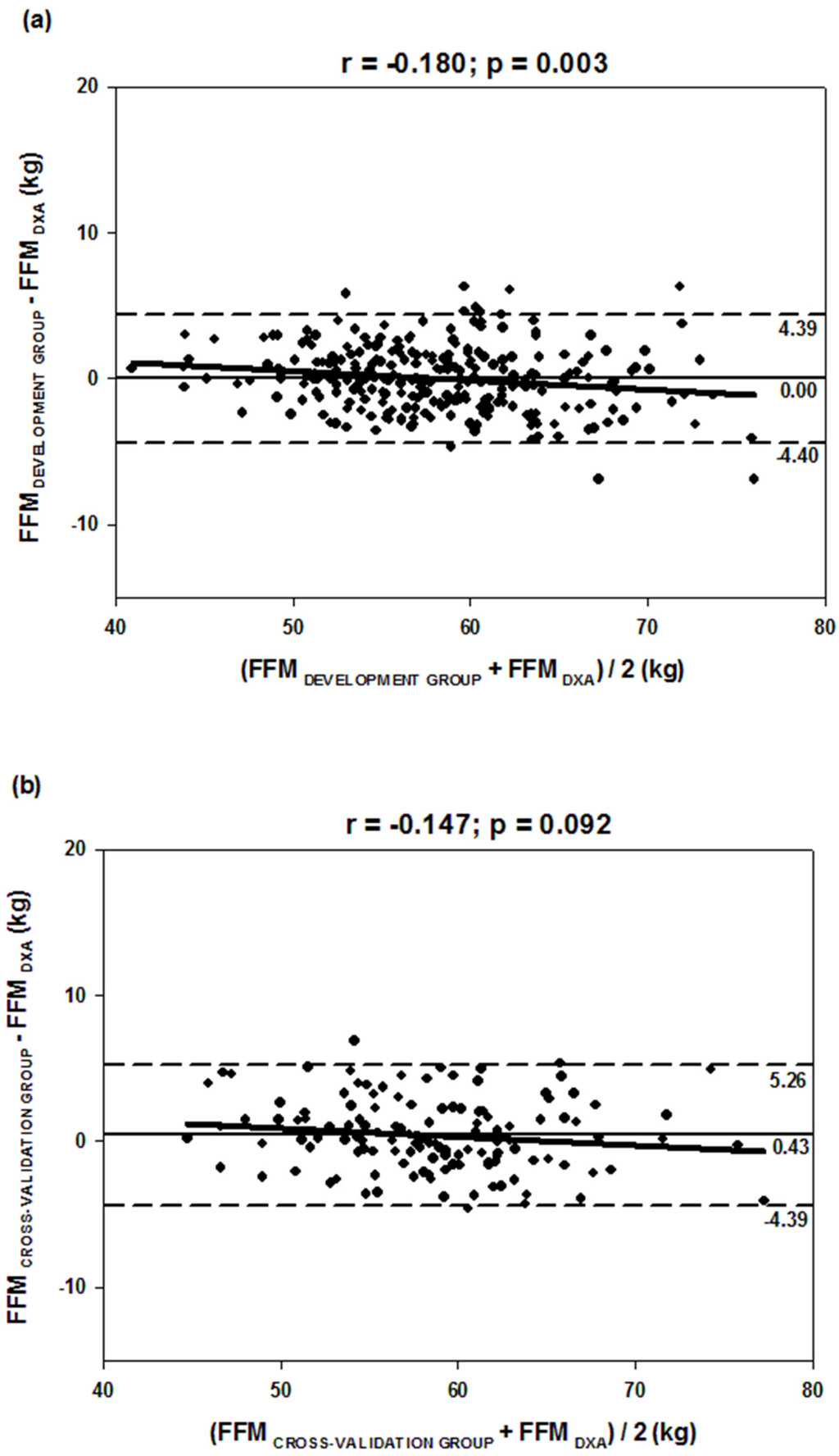 Figure 2 shows the agreement of methods (DXA and BIA) using the Bland–Altman analysis. The two groups (development and cross-validation) showed wide limits of agreement, but only development group (a) showed a significant trends (p < 0.05) between the differences and mean of methods, as observed from the r value.