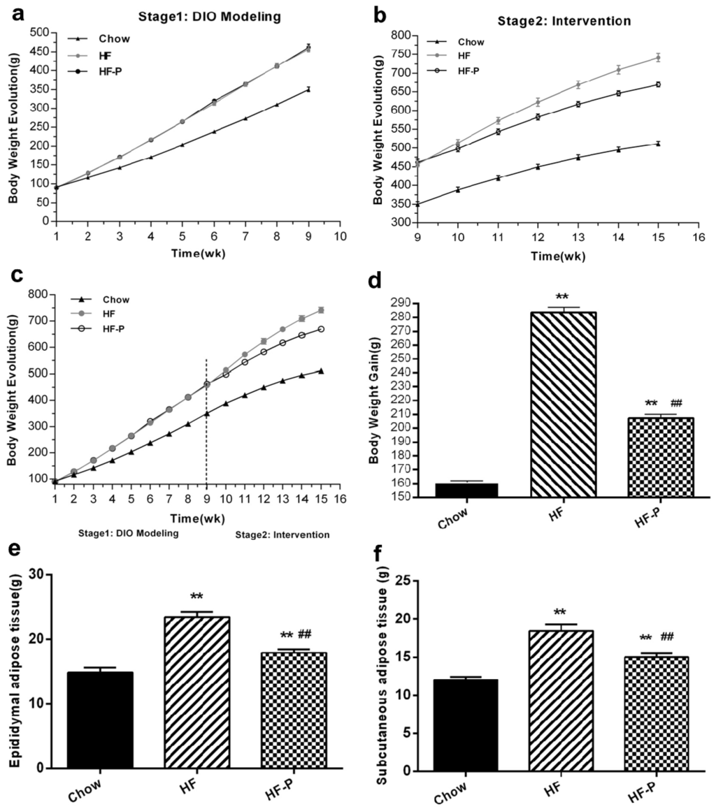 In the intervention stage, rats in the high fat diet (HF) group gained more body weight than rats in the Chow group (283.63 ± 10.17 g vs. 161.00 ± 2.88 g, p < 0.01). Importantly, rats in the HF supplemented with pectin (HF-P) group gained significantly less weight than rats in the HF group (207.38 ± 7.96 g vs. 283.63 ± 10.17 g, p < 0.01) (Figure 1). Rats in the HF group developed adipose tissue more rapidly than the Chow group (epididymal, 23.44 ± 2.36 g vs. 14.86 ± 2.04 g, p < 0.01; subcutaneous, 18.44 ± 2.36 g vs. 11.99 ± 1.21 g, p < 0.01) (Figure 1). Pectin supplementation significantly suppressed the development of adipose tissue in the HF-P group as compared with the HF group (epididymal, 17.90 ± 1.55 g vs. 23.44 ± 2.36 g, p < 0.01; subcutaneous, 15.02 ± 1.44 g vs. 18.44 ± 2.36 g, p < 0.01) (Figure 1).