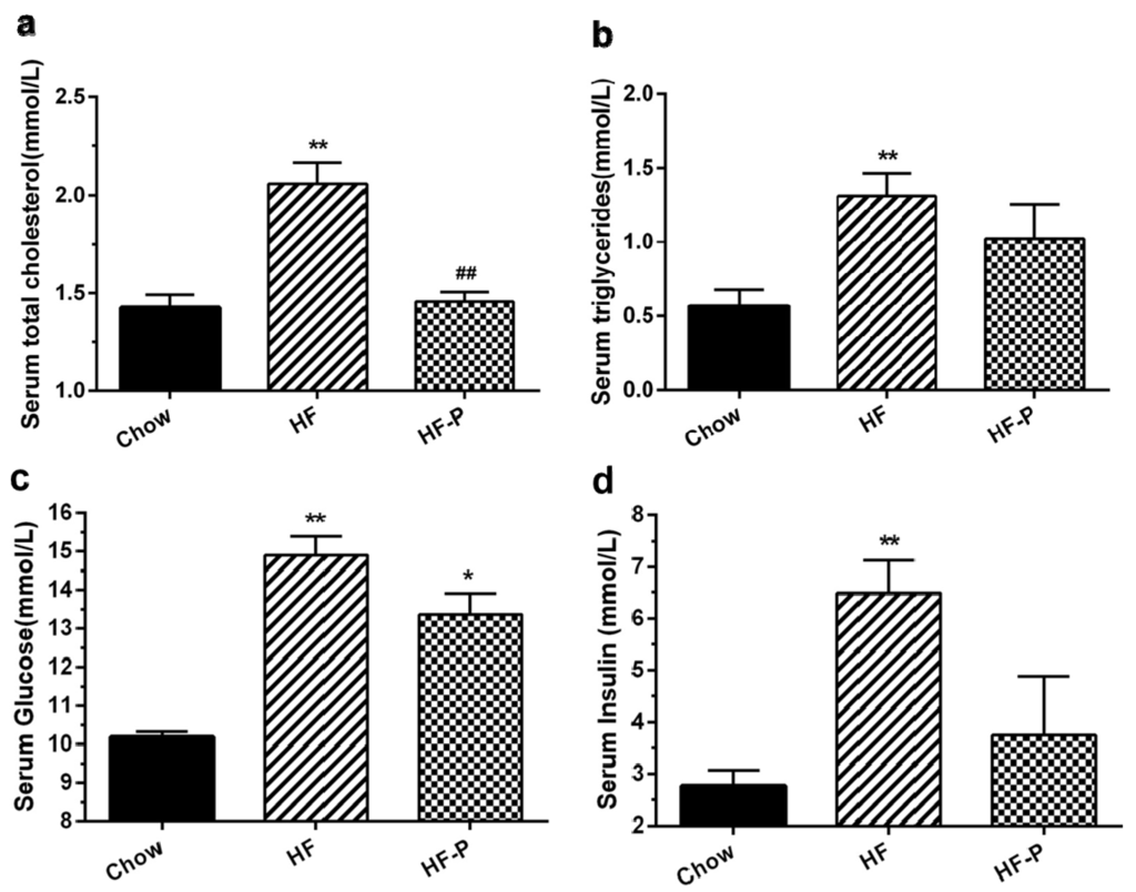 Rats in the HF group exhibited higher levels of serum total cholesterol, triglycerides, glucose, and insulin than those in the Chow group (total cholesterol, 2.06 ± 0.26 mmol/L vs. 1.43 ± 0.16 mmol/L, p < 0.01; triglycerides, 1.31 ± 0.41 mmol/L vs. 0.57 ± 0.294 mmol/L, p < 0.01; glucose, 15.14 ± 3.85 mmol/L vs. 10.18 ± 0.35 mmol/L, p < 0.01; insulin, 6.49 ± 1.82 mmol/L vs. 3.07 ± 1.14 mmol/L, p < 0.01). Total cholesterol levels were significantly decreased in rats of the HF-P group as compared with those in the HF group (1.46 ± 0.13 mmol/L, p < 0.01), while serum triglycerides, fasting serum glucose, and insulin levels showed only a trend of decrease within the duration of the study (triglycerides, 1.02 ± 0.65 mmol/L vs. 1.31 ± 0.41 mmol/L, p = 0.669; glucose, 13.37 ± 1.32 mmol/L vs. 15.14 ± 3.85 mmol/L, p = 0.607; insulin, 3.75± 3.00 mmol/L vs. 6.49 ± 1.82 mmol/L, p = 0.167) (Figure 2).
