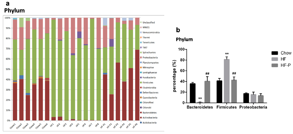 At the phylum level, rats in the HF group had a significantly lower level of Bacteroidetes and a higher level of Firmicutes than the Chow group. However, in the HF-P groups, these changes were restored to similar levels as the Chow group. There was no significant difference in the level of Proteobacteria among the three groups.